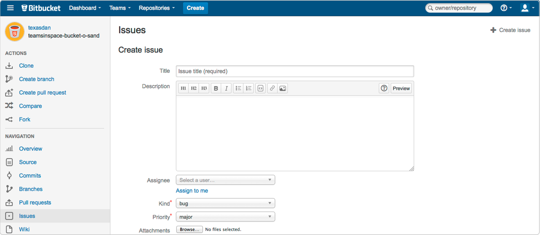 El gestor de incidencias (issues) de Bitbucket permite registrar cualquier tipo de incidencia (bug, enhancement, proposa o task) en la plataforma para que pueda ser gestionada y tratada por el equipo de desarrollo. Las incidencias deberán ser asignadas a un usuario que será el encargado de resolverla. Conviene tener en cuenta que hay que marcarlo en el momento de crear el repositorio si queremos poder utilizarlo.